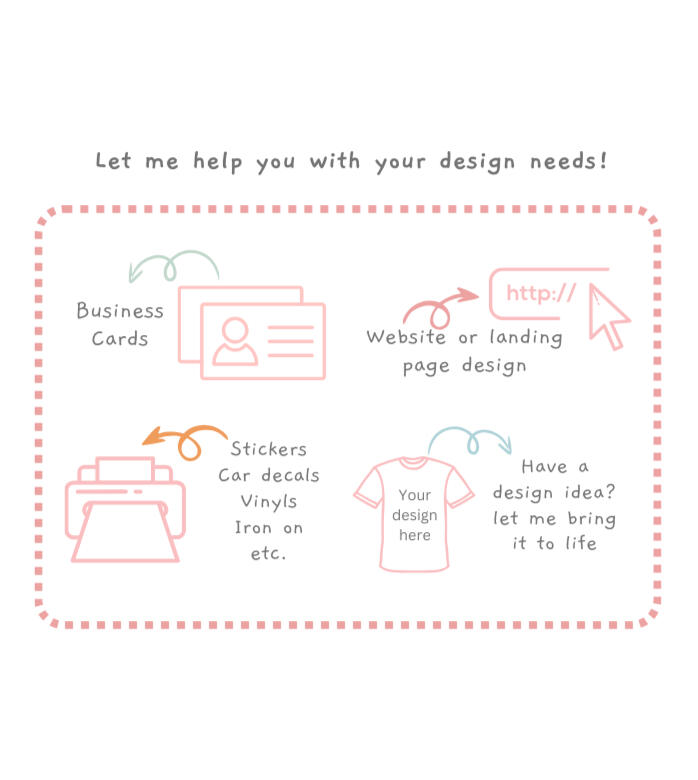I love to get crafty and utilize my skills to help others. I love to help people create landing pages for their businesses & affiliate links, business cards. I can craft up something for your business needs as well! Whatever your ideas Lets talk!- Custom Car Decal Designs